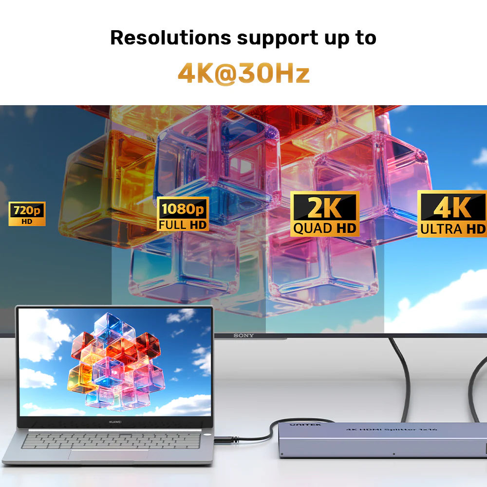 Command attention across every screen in the room with the UNITEK 1-in-16 HDMI Splitter. This industrial-grade video distribution unit is engineered for clarity, reliability, and scale, transforming one video source into a synchronized multi-display experience perfect for digital advertising, education, worship, and command centers.
